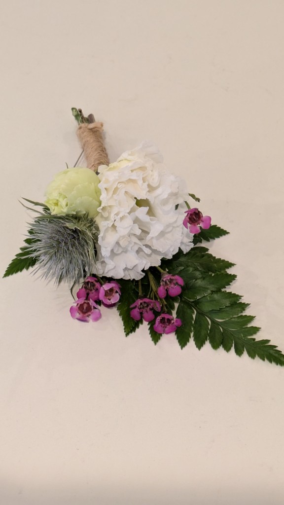 Bridegroom’s buttonhole Bridegroom’s buttonholeButtonhole Buttonholes with groom’s centreButtonholes to match bridesmaid’s bouquets above. October 2022Selection of buttonholes, each one different, including one for an infant. 29.10.2022Buttonholes made with dried flowers. November 2022Corsage Buttonholes May 2023Buttonholes June 20232 adult, 1 child buttonholes 23.9.2023Sea holly, eucalyptus and carnations 29.10.2023Boutonniere (Flowers across the top edge of the pocket) 16.12.2023Buttonholes 16.12.2023Corsage 16.12.20235 buttonholes and 2 corsages. 18.5.20246.6.202415.6.2024 Blue Irises requestedWrist corsage to match bridal bouquet 15.6.202410th April 2025 Credit: Raksmey PhotographyButtonholes for guests and groom and corsages for guests. 6.9.202529th December 2025