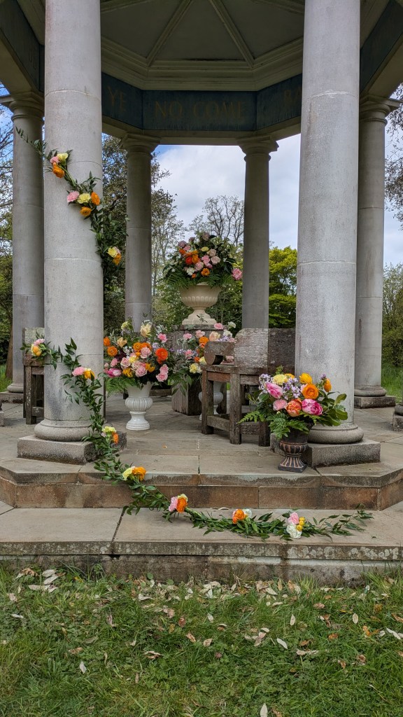 A flower arch decoration, made from wire, moss and flowers, attached to an existing willow arch. Fence decoration Gridshell Building, Weald and Downland Living Museum, Chichester 10.6.2023Wedding arch South Stoke Barn 17.6.2023Multi-coloured arch arrangement. 2.9.2023Garland above side door of South Stoke Barn, Nr. Arundel, West Sussex. 5.8.2023The ceremony area, Two Woods, near Pulborough West Sussex. 5.8.2023Lychgate decoration. Itchenor church. 2.9.2023Southend Barns, Donnington, Chichester April 2025Cottesmore Hotel, Golf and Country Club, Pease Pottage, West Sussex. 26.7.2025 Garland of fresh foliage and flowers.Bignor Park Temple April 2026Shepherd’s crook/Bow Peep design March 2023